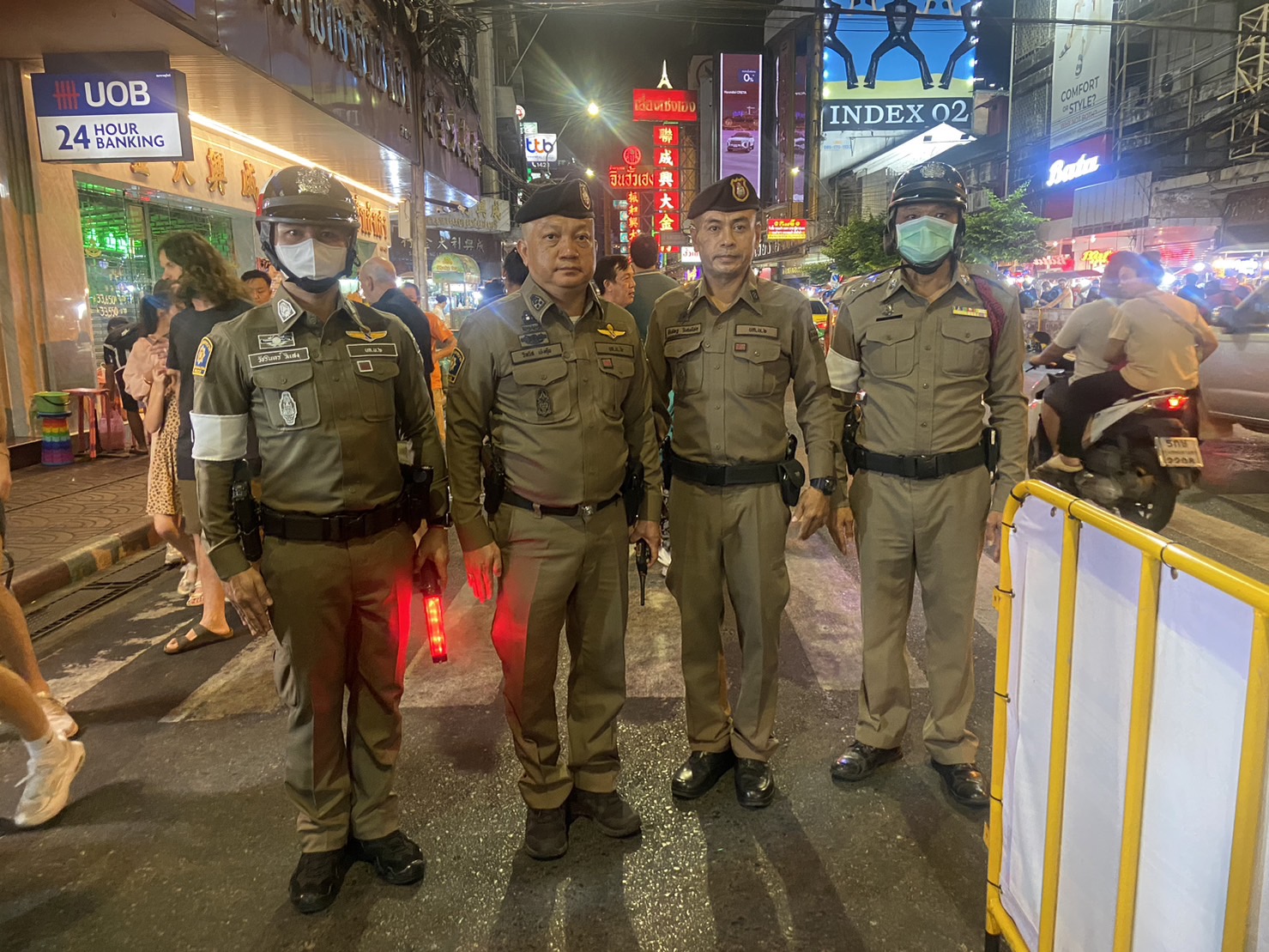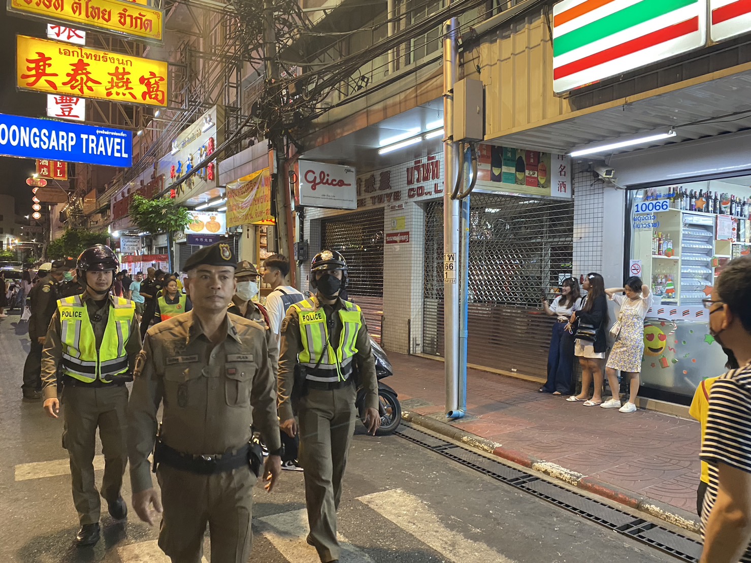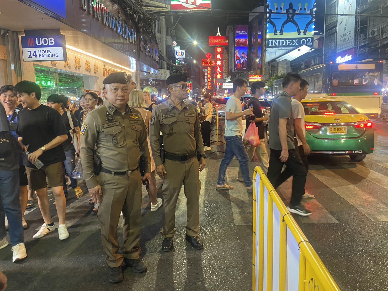 พ.ต.อ.วิทวัส เข่งคุ้ม ผกก.สน.พลับพลาไชย2 ป้องกันเหตุแก่นักท่องเที่ยว และ สายตรวจ ร่วมกับฝ่ายเทศกิจเขตสัมพันธวงศ์ ปล่อยแถว ป้องกันเหตุ ถนนเยาวราช