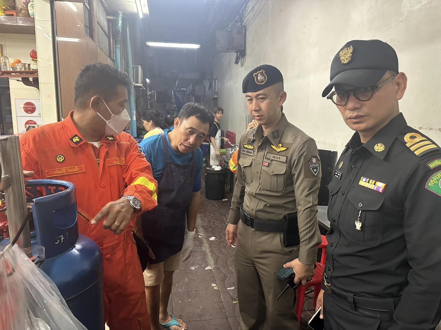 👮🏻‍♂️พ.ต.ท.มั่นวัตร์ เจริญชัยสมบัติ รอง ผกก.ป.สน.พลับพลาไชย 2 สามแยก2-3 ร่วม ว.4เจ้าหน้าที่เทศกิจ เจ้าหน้าที่ดับเพลิง ตรวจสอบถังดับเพลิง และถังแก๊ส ร้านค้า ในถนนเยาวราช้