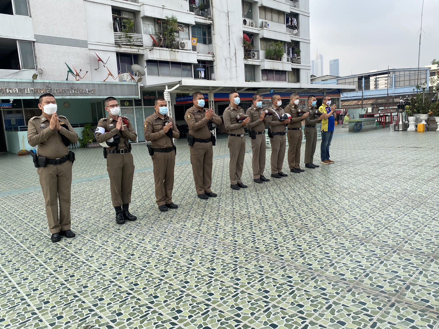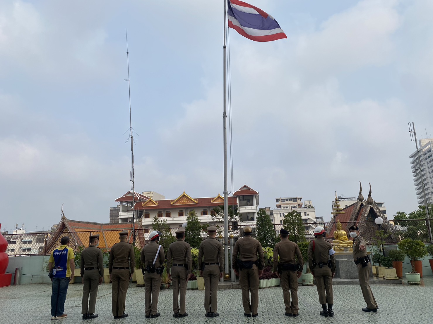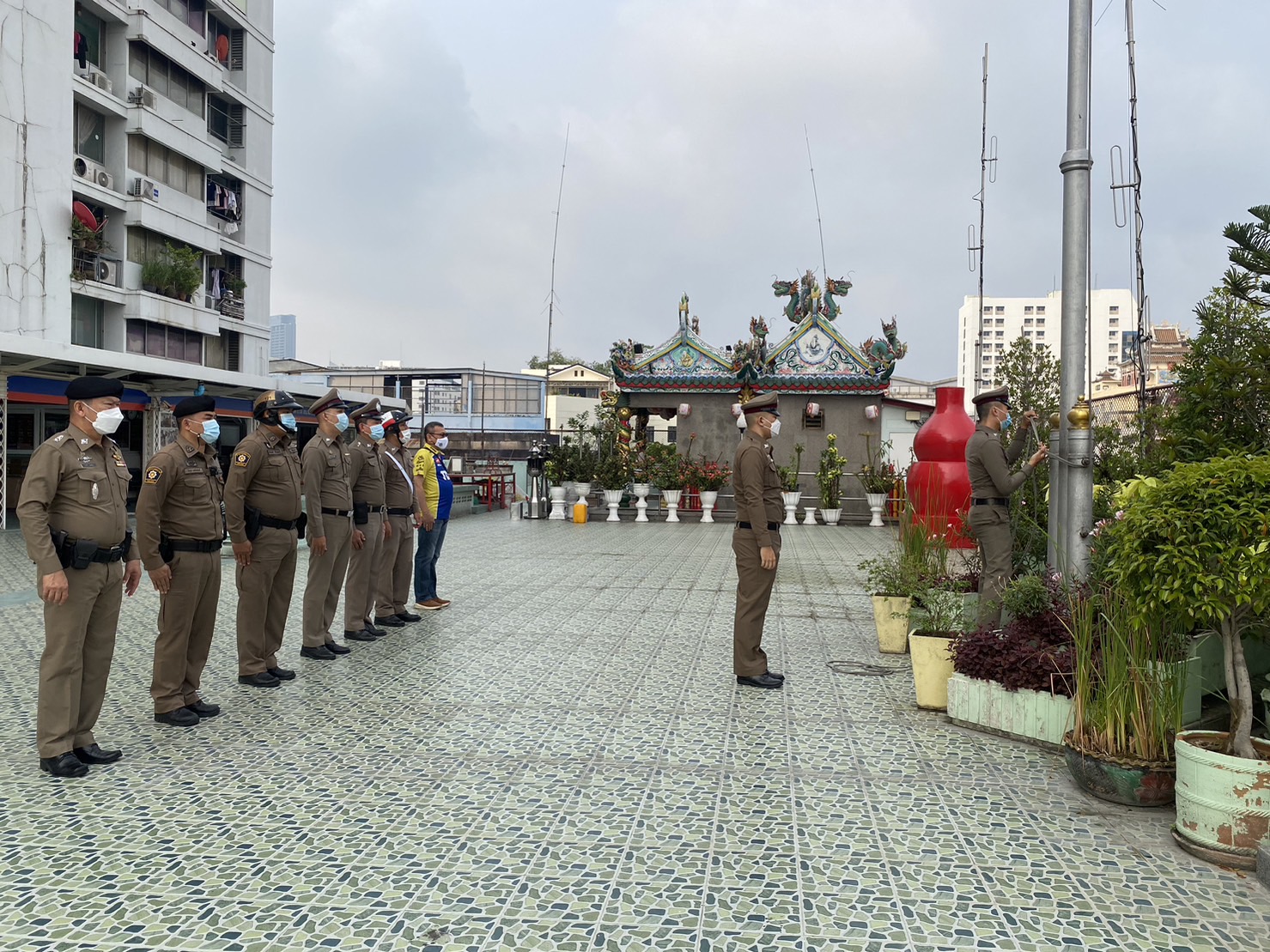 ภายใต้การควบคุมของ พ.ต.อ.พนม เชื้อทอง มอบหมายให้ พ.ต.ต.ประทีป พรมไหม พร้อมกำลังข้ราชการตำรวจ สน.พลับพลาไชย 2 เข้าแถว เคารพธงชาติ สวดมนต์ กล่าวอุดมคติ และชี้แจงข้อสั่งการ ของผู้บังคับบัญชา