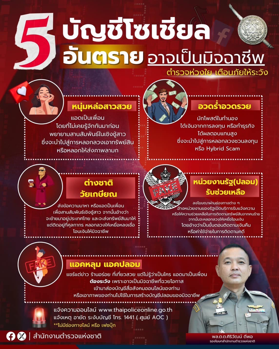 🚨ระวัง 5 บัญชีโซเชียลอันตราย แนะ ไม่รับแอด ไม่คุยแชต ไม่โอนเงิน . พล.ต.ต.ศิริวัฒน์ ดีพอ รองโฆษกสำนักงานตำรวจแห่งชาติ เปิดเผยว่า พล.ต.อ.ต่อศักดิ์ สุขวิมล ผบ.ตร. ได้มีความห่วงใยพี่น้องประชาชนที่อาจได้รับความเสียหายจากอาชญากรรมรูปแบบต่าง ๆ ซึ่งในปัจจุบันกลุ่มมิจฉาชีพยังคงมีการพัฒนารูปแบบในการหลอกลวงพี่น้องประชาชนอยู่เสมอ มีการนำหลักจิตวิทยามาปรับใช้ใช้ในการหลอกล่อให้ผู้เสียหายหลงเชื่อ และพบว่ากลุ่มมิจฉาชีพมักสร้างบัญชีสื่อสังคมออนไลน์ขึ้นมาเพื่อใช้เป็นเครื่องมือในการหลอกลวงเหยื่อ เช่น สร้างบัญชีปลอมเป็นบุคคลมีชื่อเสียง สร้างบัญชีปลอมเป็นหน่วยงานของรัฐ สร้างบัญชีที่ไม่มีตัวตนอยู่จริง(บัญชีอวตาร) หรืออ้างว่าตนเองมีฐานะร่ำรวย เป็นต้น . รูปแบบของบัญชีสื่อสังคมออนไลน์ที่ต้องระวัง เพราะอาจเป็นมิจฉาชีพมี 5 รูปแบบ ดังต่อไปนี้ 1. “หนุ่มหล่อสาวสวย” แอดท่านเป็นเพื่อน โดยที่ไม่เคยรู้จักกันมาก่อน เพื่อพยายามสานสัมพันธ์ในเชิงชู้สาว ซึ่งจะนำไปสู่การหลอกลวงเอาทรัพย์สิน หรือหลอกให้ส่งภาพลามก . 2. “อวดร่ำอวดรวย” โดยมักจะมีการโพสต์ในทำนองว่าได้เงินจากการลงทุน หรือทำธุรกิจบางอย่าง ซึ่งได้ผลตอบแทนสูง ซึ่งจะนำไปสู่การหลอกลวงชวนลงทุน หรือ Hybrid Scam . 3. “ต่างชาติวัยเกษียณ” ส่งข้อความมาหาหรือแอดท่านเป็นเพื่อน เพื่อสานสัมพันธ์เชิงชู้สาว จากนั้นอ้างว่าจะย้ายมาอยู่ประเทศไทย และจะส่งทรัพย์สินมาให้ แต่ติดอยู่ที่ศุลกากร หลอกลวงให้เหยื่อหลงเชื่อโอนเงินให้มิจฉาชีพ . 4. “หน่วยงานรัฐ(ปลอม)รับช่วยเหลือ” ลงโฆษณาผ่านช่องทางต่าง ๆ อ้างหน่วยงานของรัฐเปิดบริการรับแจ้งความ หรือให้ความช่วยเหลือในการติดตามทรัพย์สินจากคนร้าย จากนั้นจะหลอกลวงให้เหยื่อโอนเงิน โดยอ้างว่าเป็นขั้นตอนในการติดตามเงินคืน หรือค่าใช้จ่ายในการติดตามคดี . 5. “แอคหลุม แอคปลอม” แชร์แต่ข่าว ร้านอร่อย ที่เที่ยวสวย แต่ไม่รู้ว่าเป็นใคร แอดท่านมาเป็นเพื่อน ต้องระวัง เพราะอาจเป็นมิจฉาชีพที่ฉวยโอกาสเข้ามาส่องบัญชีสื่อสังคมออนไลน์ของท่าน หรือเอาภาพของท่านไปใช้ในการสร้างบัญชีปลอมของมิจฉาชีพ . สำนักงานตำรวจแห่งชาติ จึงขอแนะนำให้พี่น้องประชาชน “ไม่รับแอด ไม่คุยแชต ไม่โอนเงิน” บัญชีสื่อสังคมออนไลน์ที่มีลักษณะดังกล่าว เพื่อลดโอกาสที่ท่านจะตกเป็นเหยื่อของกลุ่มมิจฉาชีพ ที่สร้างบัญชีสื่อสังคมออนไลน์ขึ้นมาเพื่อหลอกลวงพี่น้องประชาชน . สุดท้ายนี้ หากพี่น้องประชาชนได้รับความเสียหายจากอาชญากรรมทางเทคโนโลยี สามารถแจ้งความร้องทุกข์ได้ที่ศูนย์รับแจ้งค