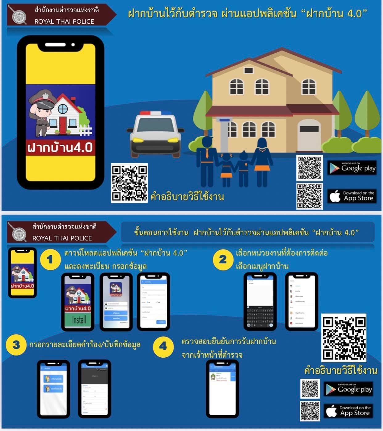 สำนักงานตำรวจแห่งชาติได้จัดทำโครงการประชารัฐร่วมใจดูแลความปลอดภัยบ้านประชาชนช่วงเทศกาลสงกรานต์ ประจำปี 2565 (ฝากบ้าน 4.0) ระหว่างวันที่ 8 - 17 เม.ย.2565 “โครงการฝากบ้านไว้กับตำรวจ” ผ่านแอปพลิเคชัน “ฝากบ้าน 4.0” โดยให้พี่น้องประชาชนที่มีความประสงค์เข้าร่วมโครงการดังกล่าวสามารถขอรับบริการโดยมีขั้นตอน ดังนี้ 1. เปิดแอปพลิเคชัน “ฝากบ้าน 4.0” แล้วลงทะเบียนกรอกข้อมูล 2. เลือกหน่วยงานที่ต้องการติดต่อ (สถานีตำรวจที่ขอรับบริการฝากบ้าน) 3. เลือกเมนู “ฝากบ้าน” แล้ว กดเลือก “ฝากบ้านของฉัน” 4. กรอกรายละเอียดคำร้อง 5. ตรวจสอบคำร้อง ผ่านเมนู “ข้อมูลของฉัน” นอกจากการดำเนินโครงการฝากบ้านผ่านแอปพลิเคชันแล้ว สำหรับพี่น้องประชาชนท่านใดที่ต้องการ เข้าร่วมโครงการสามารถแสดงความจำนงค์ด้วยการยื่นแบบฟอร์มเข้าร่วมโครงการฯ ที่สถานีตำรวจที่บ้านของท่านอยู่ในเขตพื้นที่รับผิดชอบได้เช่นเดียวกันทั้งนี้ ขอประชาสัมพันธ์แจ้งเตือนอาชญากรรมที่อาจเกิดขึ้นในช่วงเทศกาลสงกรานต์ 1. การป้องกันการโจรกรรมทรัพย์สินภายในบ้าน หากมีความจำเป็นที่ต้องเดินทางออกจากที่พักอาศัย ให้ทำการปิดล็อคประตู และหน้าต่างให้เรียบร้อย และไม่ควรละทิ้งเด็ก หรือผู้สูงอายุให้อยู่บ้านเพียงลำพัง หากต้องออกจากบ้านหลายวันติดต่อกัน ก็ขอเชิญชวนให้เข้าร่วมโครงการฝากบ้านไว้กับตำรวจ 2. ระวังการถูกประทุษร้ายต่อทรัพย์ขณะออกไปทำธุระนอกบ้าน ท่องเที่ยว หรือเล่นน้ำสงกรานต์ ขอความร่วมมือประชาชนไม่ควรสวมใส่เครื่องประดับ หรือของมีค่า หรือวางทรัพย์สินไว้ในรถ ซึ่งเป็นการจูงใจให้คนร้ายก่อเหตุประทุษร้ายต่อทรัพย์ได้ 3. อย่าหลงเชื่อกลุ่มคนร้ายที่อ้างตนเป็นเจ้าหน้าที่ เข้ามาเพื่อขอรับบริจาค หรือขอรับความช่วยเหลืออื่นๆ ทั้งมาติดต่อที่บ้าน หรือทางออนไลน์ อย่ามอบหรือโอนเงินอย่างเด็ดขาด และไม่เปิดช่องทางให้คนร้ายที่แฝงตัวมาในรูปแบบอื่นๆ เช่น ช่างไฟฟ้า ประปา เข้ามาในบริเวณบ้านพักอาศัย สำนักงานตำรวจแห่งชาติ มีความห่วงใยความปลอดภัยในชีวิต และทรัพย์สินของพี่น้องประชาชนที่เดินทางท่องเที่ยว หรือกลับภูมิลำเนาในช่วงเทศกาลสงกรานต์ 2565 ได้กำหนดมาตรการป้องกันเหตุประทุษร้ายเกี่ยวกับทรัพย์ การรักษาความปลอดภัยสถานที่จัดงาน ป้องกันเหตุทะเลาะวิวาทในโรงพยาบาล และเหตุอื่น ๆ เจ้าหน้าที่ตำรวจทุกนายมีความตั้งใจปฏิบัติงาน และให้บริการในช่วงเทศกาลสงกรานต์อย่างเต็มที่ หากพบเห็นการกระทำความผิด หรือต้องการความช่วยเหลือ กรุณารีบแจ้งสถานีตำรวจใกล้บ้านท่าน หรือโทร. สายด่วน 191 ได้ตลอ